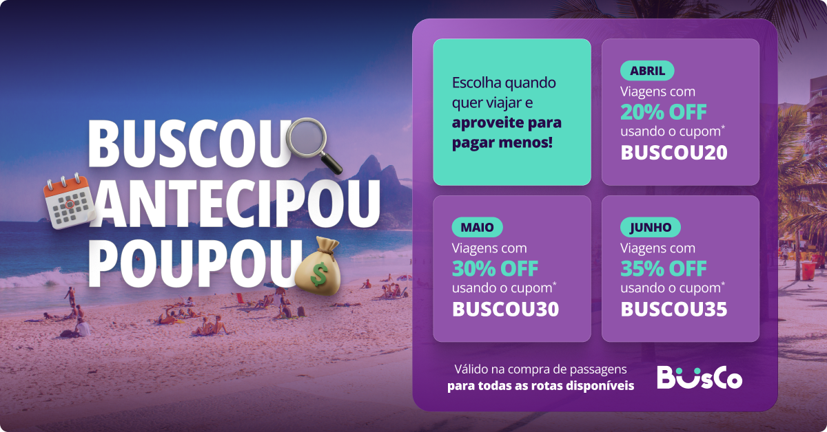 🚌 Use o cupom BUSCOU20, BUSCOU30 ou BUSCOU35 e garanta até 35% OFF na compra de passagem de ônibus para todas as rotas da BusCo.