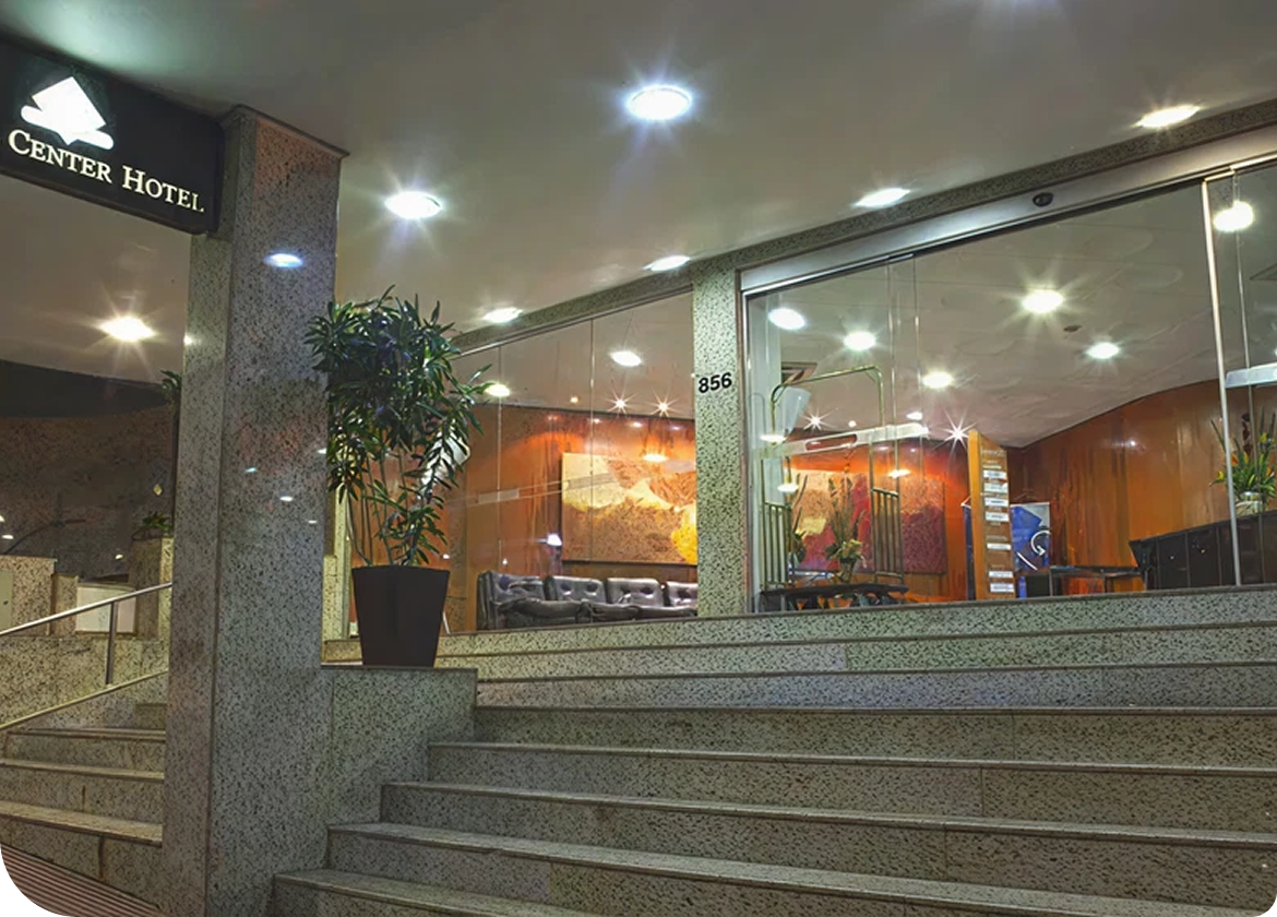 Entrada do Royal Center Hotel Lourdes, em Belo Horizonte, com fachada iluminada, escadaria de acesso e área interna visível através de portas de vidro.