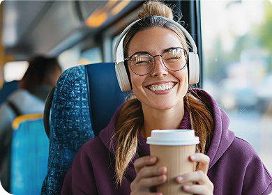 Pessoa sentada em um ônibus, usando fones de ouvido e óculos, segurando um copo de café e sorrindo, em um ambiente confortável e iluminado pela luz natural.