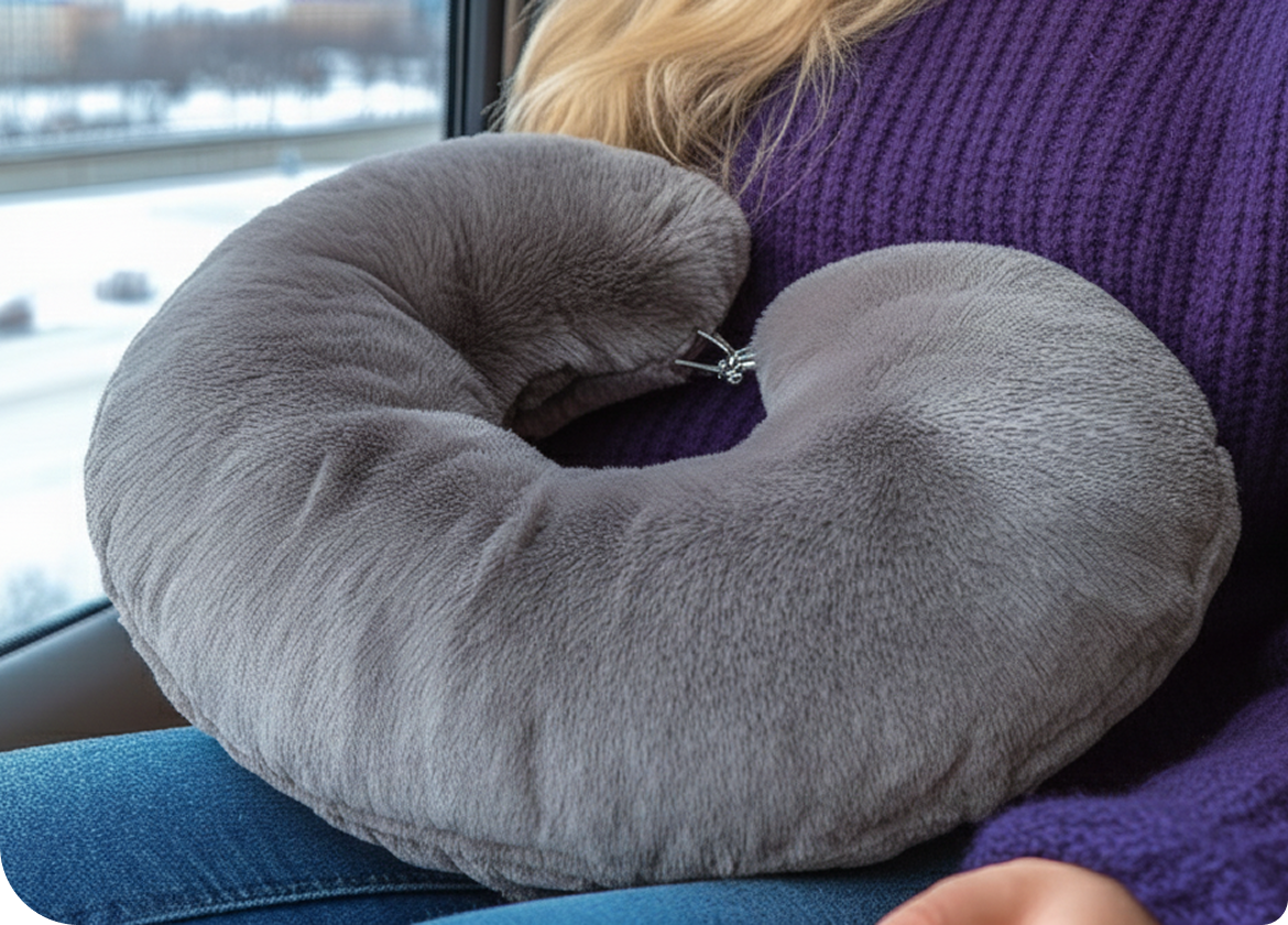Travesseiro de pescoço apoiado no ombro de uma passageira, proporcionando mais conforto durante a viagem de ônibus.