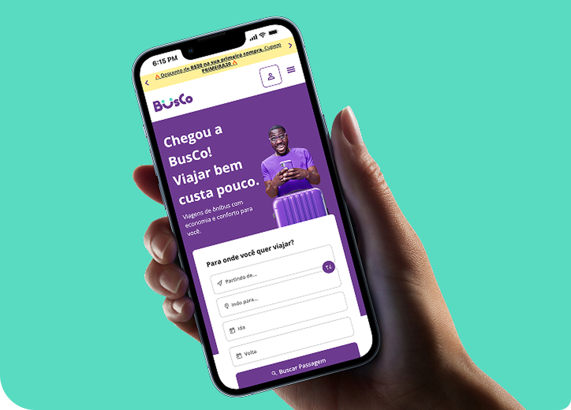 Pessoa segurando um smartphone com a página inicial da BusCo aberta, exibindo a busca por passagens de ônibus com foco em economia e praticidade.