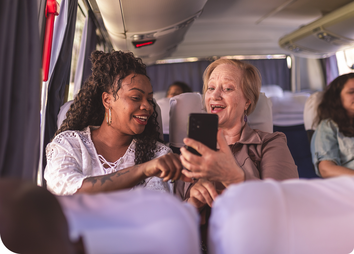Duas passageiras conversando e sorrindo dentro de um ônibus confortável, enquanto uma delas mostra algo no celular durante a viagem.