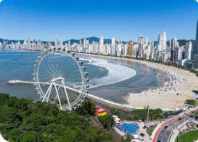 Vista de Balneário Camboriú com destaque para a roda-gigante à beira-mar, prédios altos e a praia ao fundo.