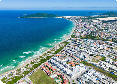 Vista aérea de Cabo Frio mostrando a extensa faixa de areia, o mar azul e parte da cidade ao fundo.
