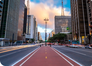 Avenida Paulista ao pôr do sol, vista do meio da via com ciclovia, carros em movimento e prédios iluminados ao fundo.