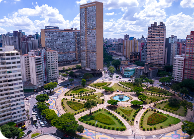 Vista aérea de uma praça verde em Belo Horizonte, cercada por prédios, com formato geométrico e áreas arborizadas.
