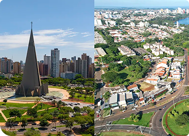 À esquerda, a Catedral de Londrina vista à distância, com arquitetura pontiaguda, pessoas caminhando ao redor, muito verde e céu claro. À direita, a vista aérea de Maringá com área urbana próxima a um rio, muitas árvores, casas, rodovia e bairros residenciais.