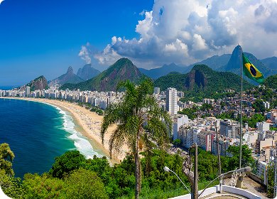 Vista aérea lateral da capital do Rio de Janeiro com montanhas ao fundo, área urbana e a praia se estendendo ao longo da orla.
