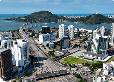 Vista aérea de Vitória, com a Ponte Deputado Darcy Castello de Mendonça sobre a Baía de Vitória, áreas montanhosas ao redor e avenidas movimentadas da cidade.