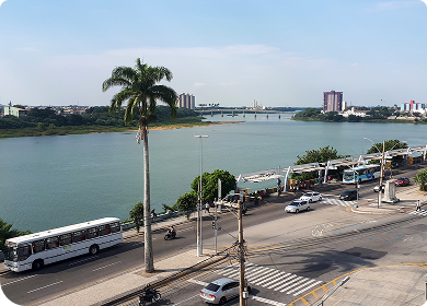 Vista urbana de Campos dos Goytacazes, com o Rio Paraíba do Sul ao fundo, a Ponte Barcelos Martins ao longe, ônibus circulando pela avenida e pessoas caminhando.