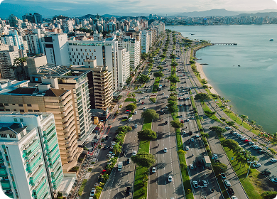 Avenida Beira-Mar Norte em Florianópolis, com prédios à esquerda, o mar à direita e céu ensolarado.