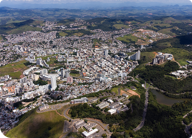 Vista aérea de Juiz de Fora mostrando a cidade entre montanhas, com prédios, bairros e relevo ao fundo.