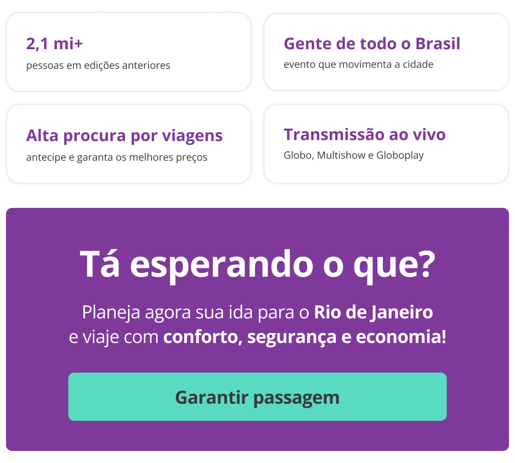 Para quem está em outra cidade e quer curtir a apresentação da colombiana ao vivo, a BusCo oferece passagens de ônibus para o Rio de Janeiro com ótimos preços, diversas opções de horários e tudo 100% online, de forma simples e facilitada. Assim, você garante sua viagem com antecedência, escolhe o melhor horário e chega ao Rio pronto para aproveitar o show com tranquilidade.